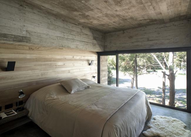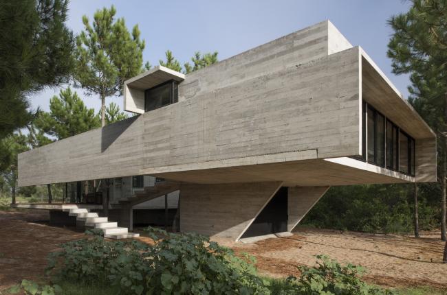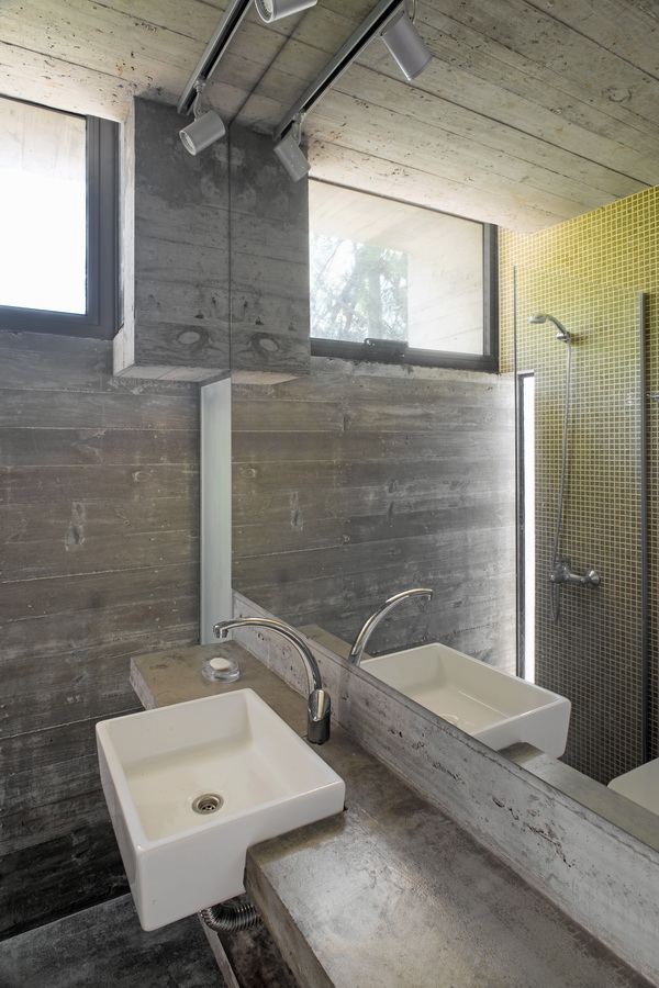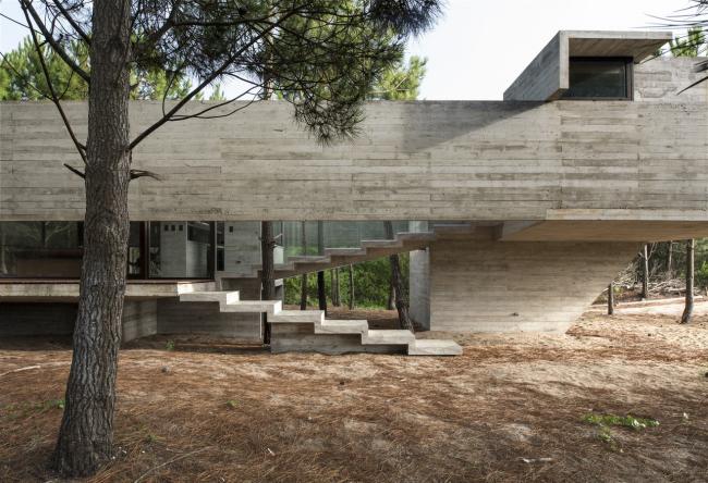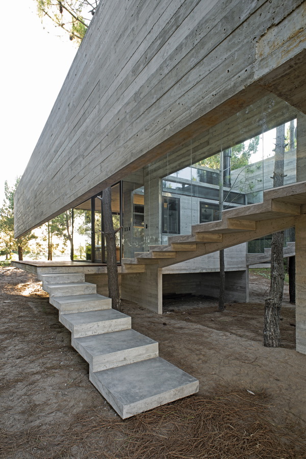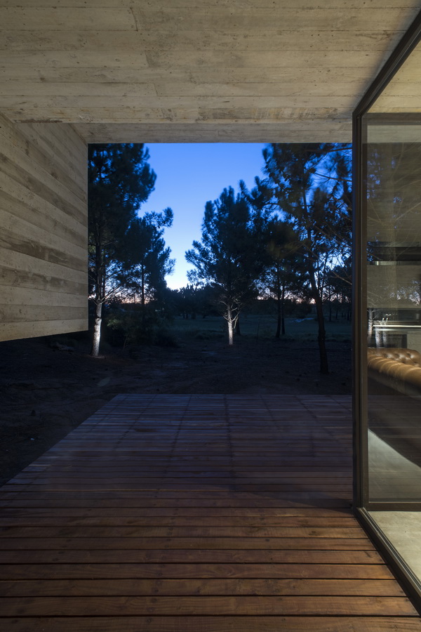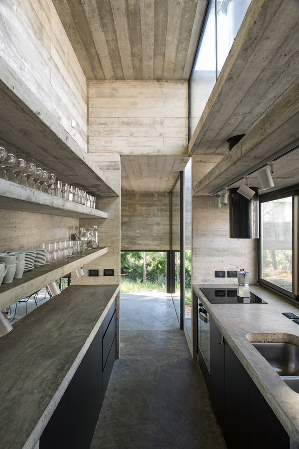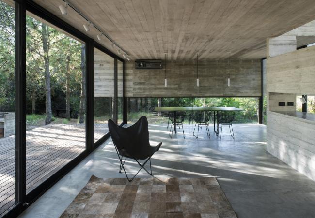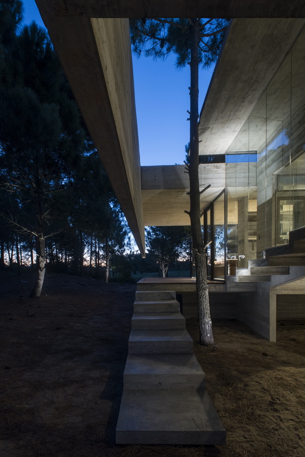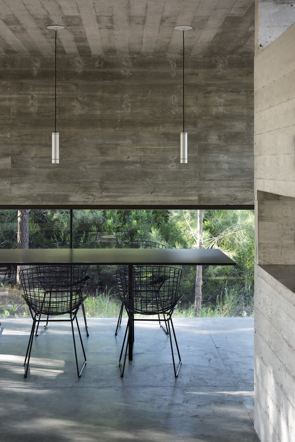 连接两个平台的玻璃桥穿过一条松树环绕的长廊,在长廊上,光线从屋顶落下,洒落在树枝上。这样,森林的生命力就被引入了房子。外墙和内隔墙都是由清水混凝土制成,地板则是由光滑的混凝土制成。