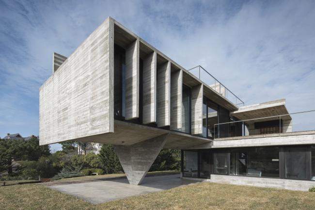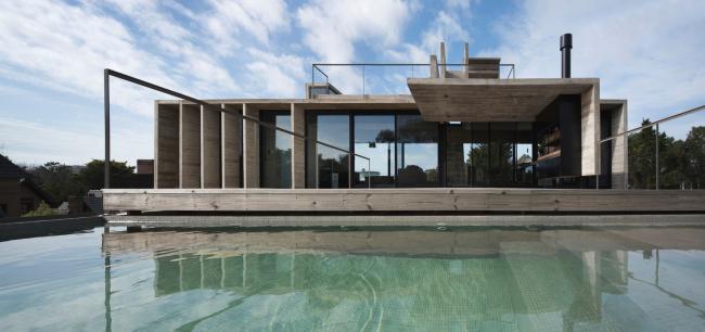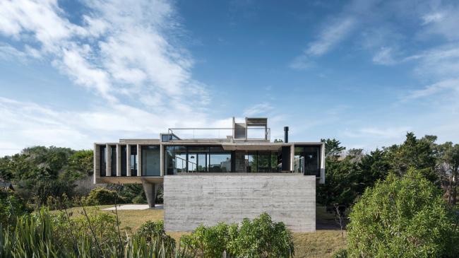 项目委托中要求设计一个度假性质的住宅,功能包含与社交区相连的主卧室套房、独立的客房区、室外休息室、烧烤区、游泳池和日光浴区域。业主非常重视住宅内的景观视野和如何保护自己免受来自海洋的寒冷东南季风侵袭这两方面的内容。为了满足这些要求,这所房子被安置在地块的最高标高处,高于街道三米。主要区域被安置在上层空间中,下方由客房和服务区体量进行支撑,并为停车位提供顶部遮盖。这样的功能布局最终会形成两个独立的体量,二者通过垂直交通体进行连接。