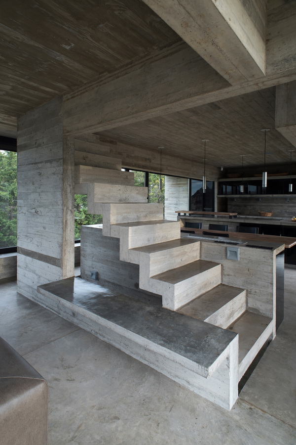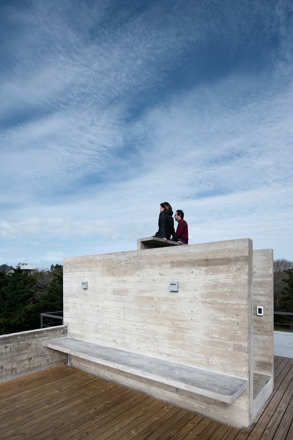 主体量顶部另设有露台,俯瞰邻近的房屋还可以欣赏到四周景观。楼梯夹在两堵混凝土墙之间,通向上层的私密空间,私密空间内带有一条混凝土长凳,形成一处私人眺望台,面朝大海,静谧安宁。为烧烤区提供支撑的结构墙还可以保护半遮盖露台和休息区免受从西侧照射来的水平向光线。与此有异曲同工之妙的是悬挂在一楼楼板上的混凝土屏风,既可以遮挡照入主卧室的阳光,又可以过滤掉从露台上看过来的视线。