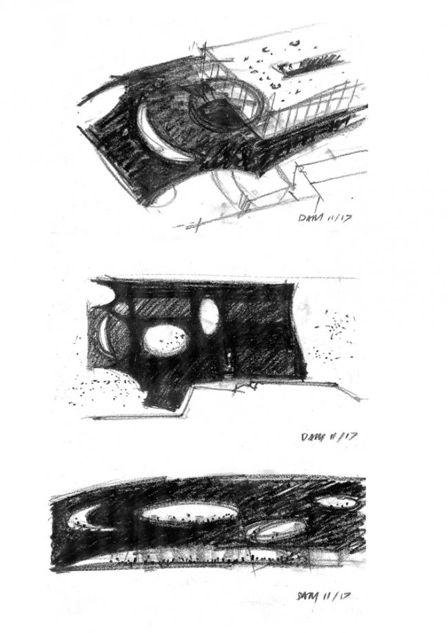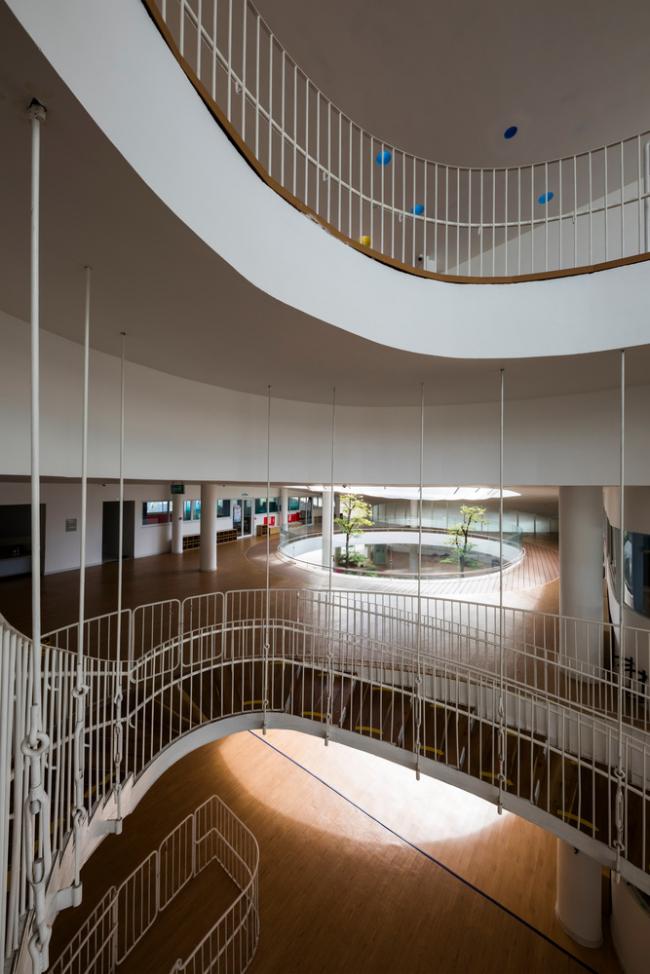 从外部造型上来说,幼儿园将两个独立的体量进行了区分,一个是斜坡形的,另一个是位于山上的几何体量,为体育和艺术活动提供了灵活的空间,同时还能拥有远眺无尽城市的壮阔视野。坡地下面的空间,即“小山”的内部用作教室,由一个大型的多功能厅连接,是幼儿园的一个中心组成部分,允许孩子们在日常和特殊场合进行各种教育活动。
