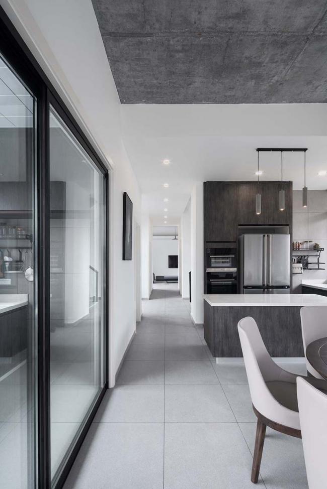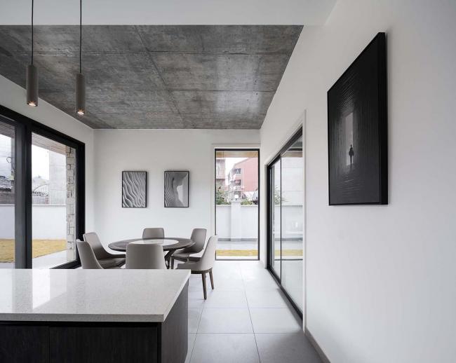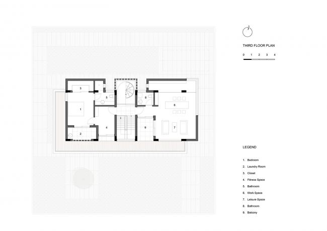 首层作为共享空间,朝向南北两个庭院开敞的起居室是视觉的起点,穿过玄关和楼梯,配有独立中西厨房的餐厅是视觉的终点;二层作为居住空间,两个居住套房均布置有书房、衣帽间和独立卫生间,并共享了南侧长达18米的阳台;顶层是业主的私人办公与生活空间,自带庭院的工作室和配有健身房的独立套房通过L型的露台建立了室外空间的联系,北侧的庭院设置了一部旋转楼梯可以到达屋面。
