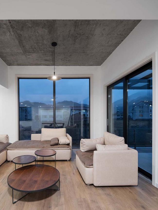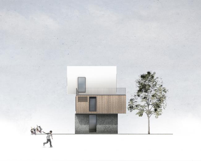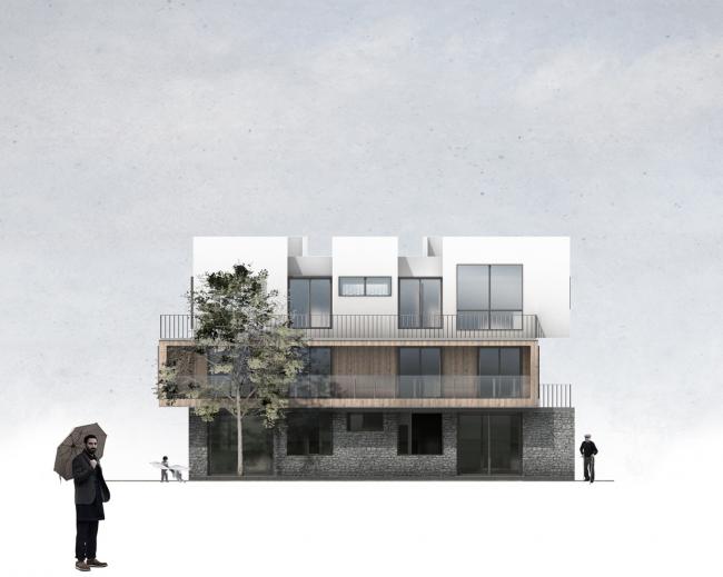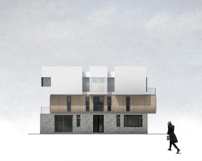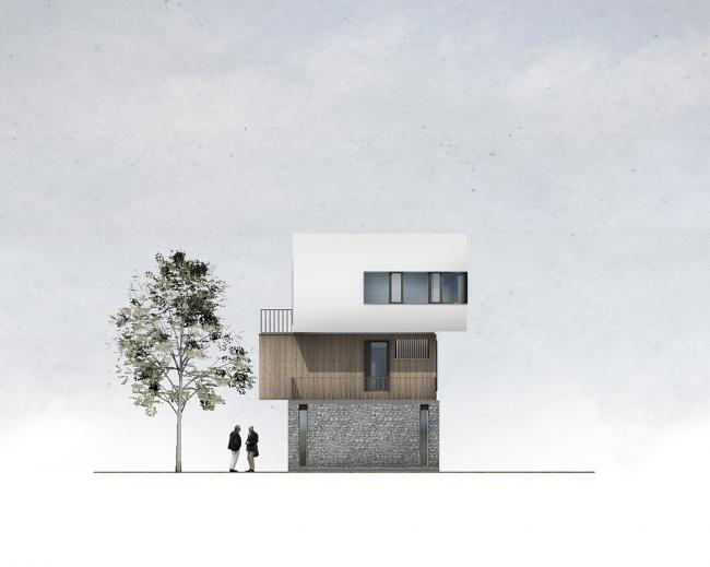 建筑首层墙面选用的石材,是从当地出产花岗岩工厂的废料中选取,由当地传统匠人(BIM学习)完成砌筑进行废物利用,随机排布形成自然美感的同时增强了建筑的保温性能。二层墙面的木材是当地最丰富的自然资源,经过防腐处理后体现出了更加温暖柔和的质感,随着时间的推移木材将会逐渐褪成灰色,与灰色石材相得益彰。顶层墙面则采用最普通的白色涂料,与大面积玻璃门窗形成虚实对比,维持了建筑纯净质朴的气质。