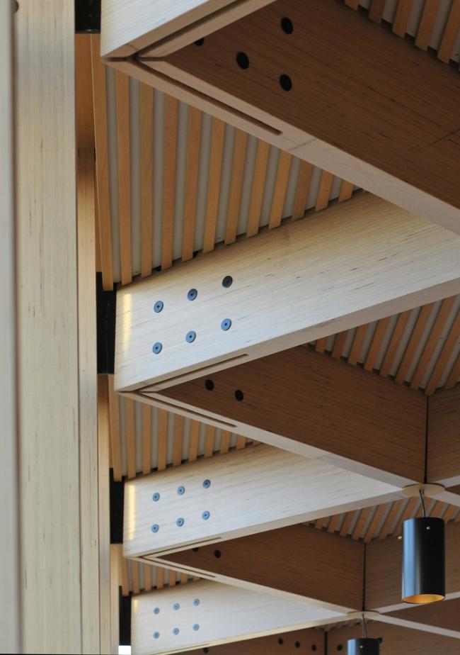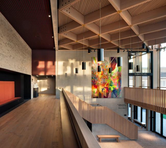 这个新的艺术中心包括一个400个座位的礼堂,一个适应性的门厅空间,包括一个大型的日间排练和教学室,一个展览空间和完整的后勤更衣室,车间和辅助空间,以及一系列的套件教室。三层高的带有“斜纹”木质屋顶结构的画廊门厅,自然采用日光照明,俯瞰着一个园景庭院,将成为学校的新中心区域。