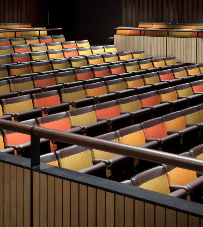 所以我们特别委托相关纺织品艺术品,由格拉斯哥的艺术家维多利亚莫顿(Victoria Morton)设计,他与学生一起工作并探索了学校档案调查背景以供设计研究。在爱丁堡的Dovecot工作室创建,从建筑物的入口处可以看到这些艺术壁挂,并在两层的联通处连接门厅。礼堂成为了一个丰富,黑暗的木质衬里空间,与苍白的木质门厅形成了鲜明的对比。它为舞蹈,戏剧,装配,音乐和演讲提供了一个美丽而温馨的空间,将观众包裹在表演者周围,同时在需要时采用更加传统的结构形式。