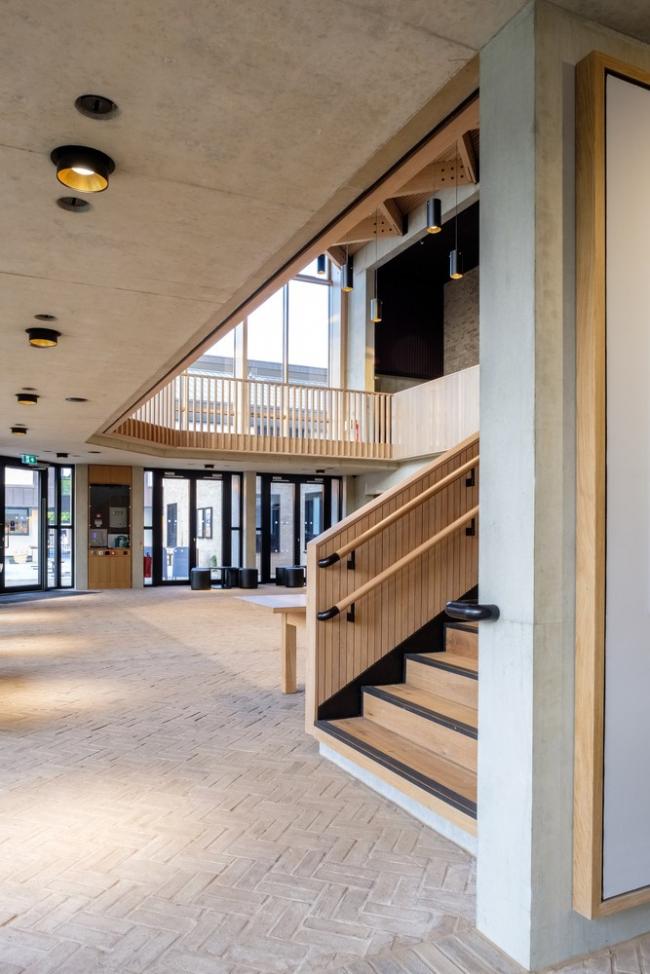 该空间在学校期间作为学生和工作人员使用的咖啡馆,并在礼堂的活动期间能够作为观众的门厅同时使用。高耸的门厅横跨庭院的整个宽度,可以融合建筑物,模糊其内外部空间之间的边界。
