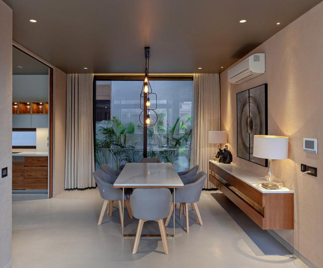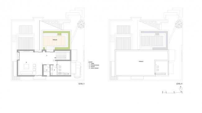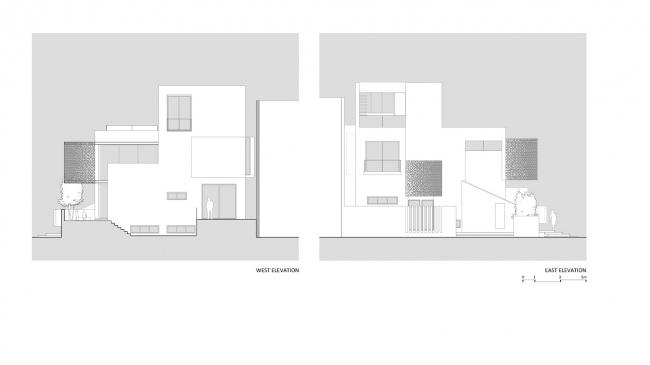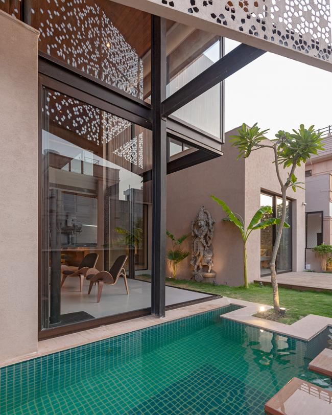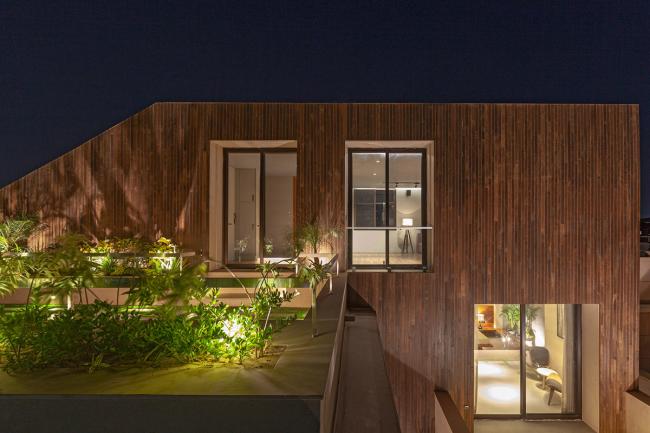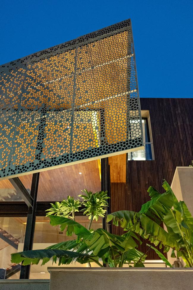 寺庙存在于庭院上方的一个突出的体量中,立面上的幕墙通过过滤光线达到内部所需的隐私要求。三楼的媒体室延伸到大型家庭露台上;从餐具室内可以看到另一个露台、浴室和大厅。全高的滑动门将媒体室烘托的更加高大。
