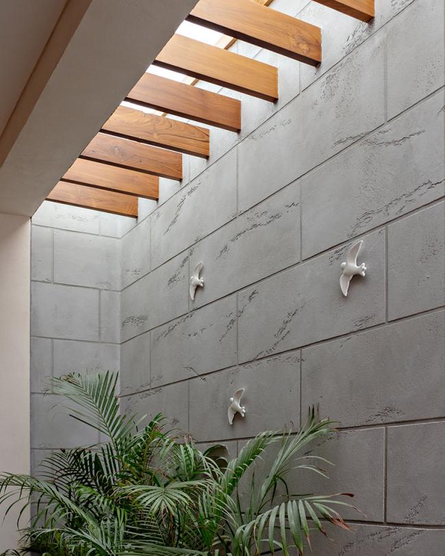 一楼设有停车场,地下室设有自然采光的办公室和设备用房。在入口台阶、水体和复合墙等部分使用了当地的焦特布尔石头。室外的质感石材灰泥饰面与焦特布尔石材的颜色十分契合,该石材也在室内作为部分饰面使用,以增加整体的室外感觉和外观性。