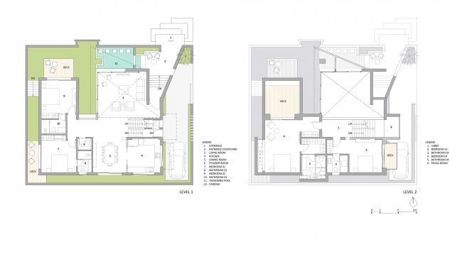 二楼的两间卧室有一个公共平台(看起来像盒子一样悬挂在餐厅上方)。主套房内的卧室带有两个座椅休息区;其中一个是带夜光灯的绿植区域,设有舒适的长椅座位、更衣区和一个大型水疗浴室;另一个休息区可以俯瞰私人露台,可以吸引小鸟与之为伴,很适合轻松而惬意的早晨。