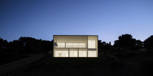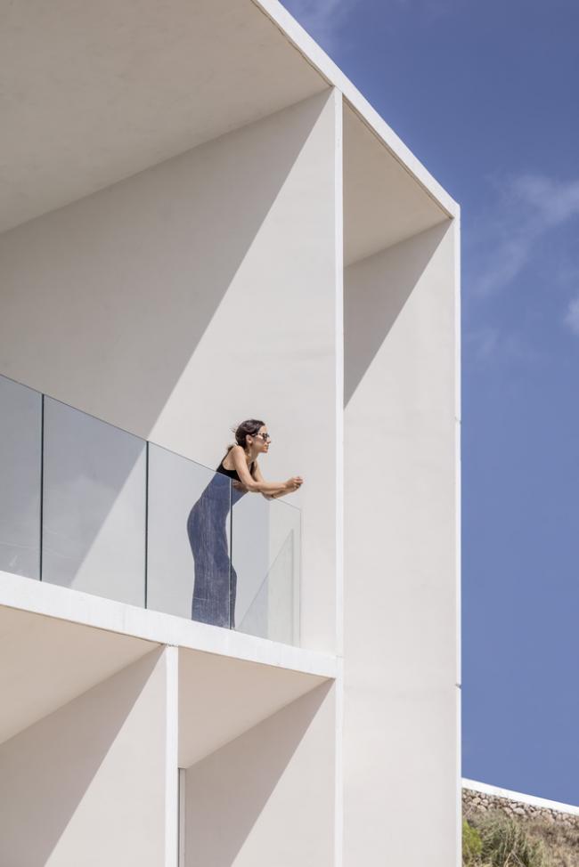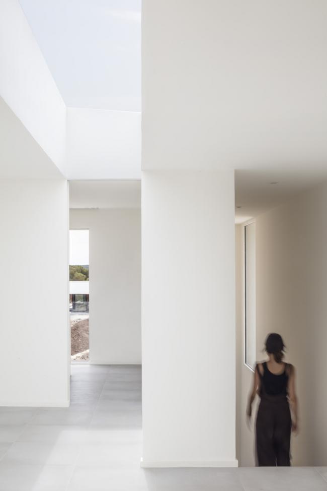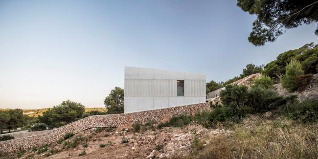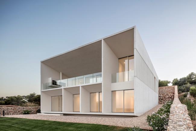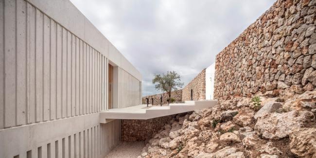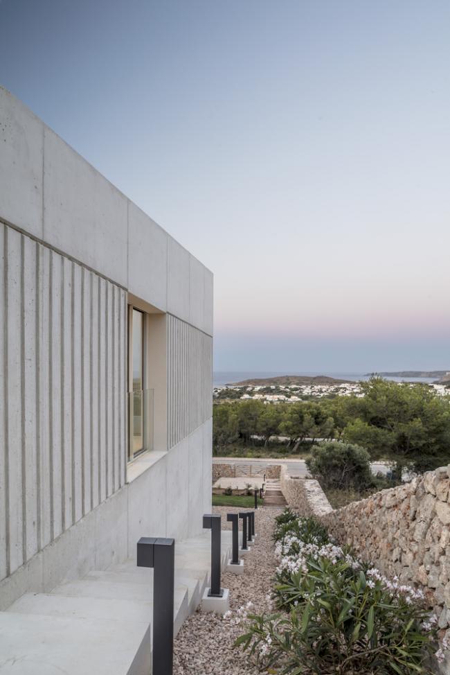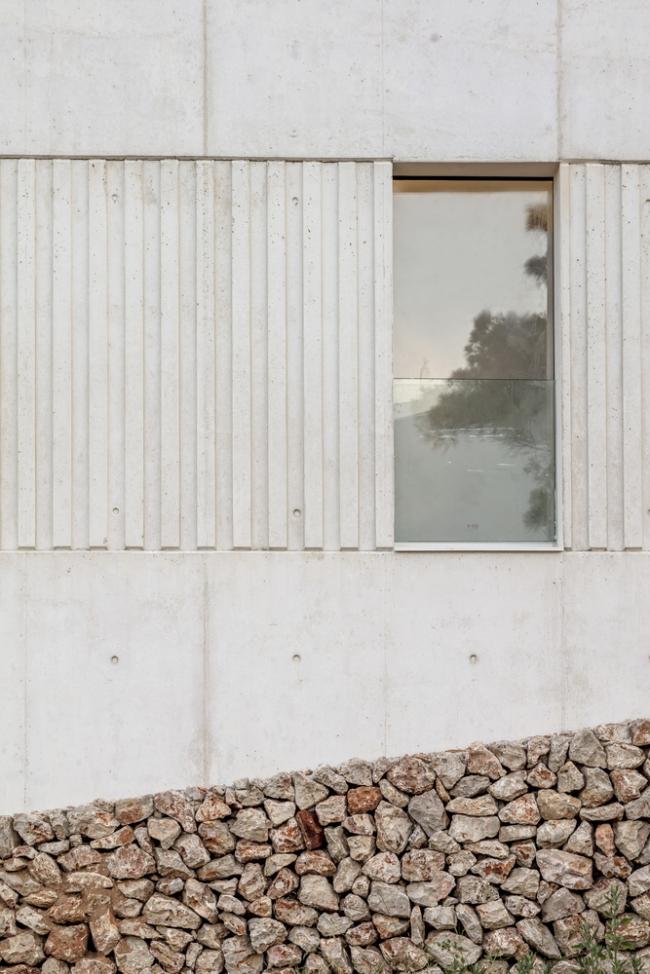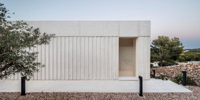 外立面选用现浇混凝土作为零维护材料,混凝土在梅诺卡岛的高湿度和极端盐水平的侵蚀性气候中会很好地随岁月老化得愈加迷人。房子的灰白色立面与房子周围的赭色和赤土色土壤融为一体。最后,立面上的垂直条纹浮雕带围绕着门窗,使建筑立面在视觉上得到统一。