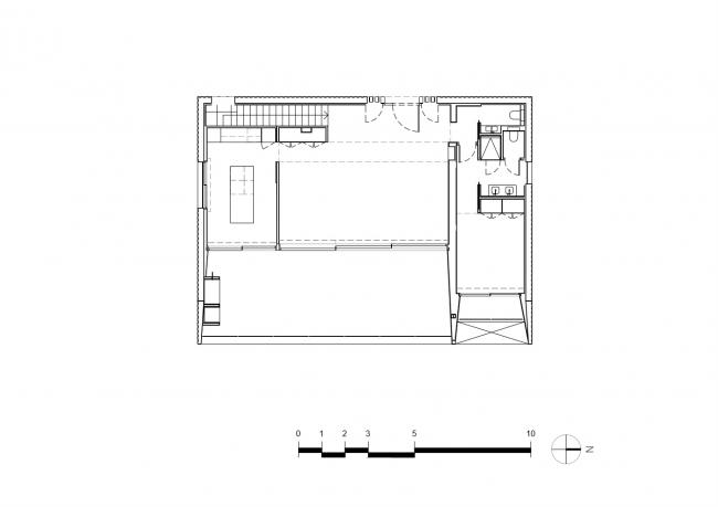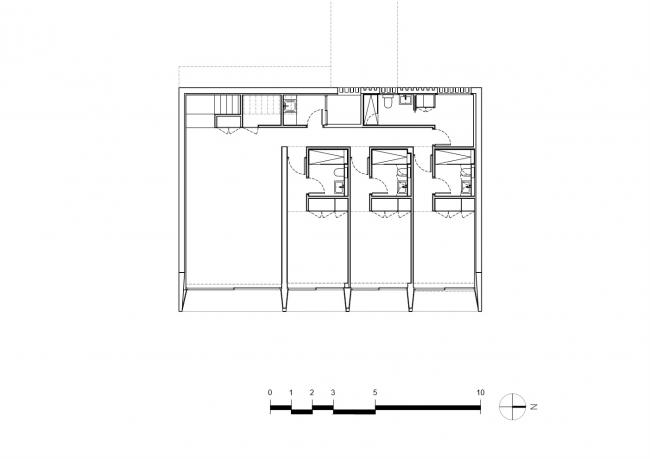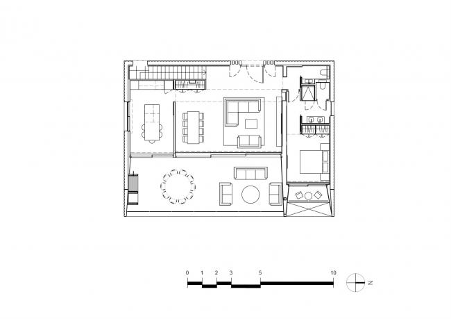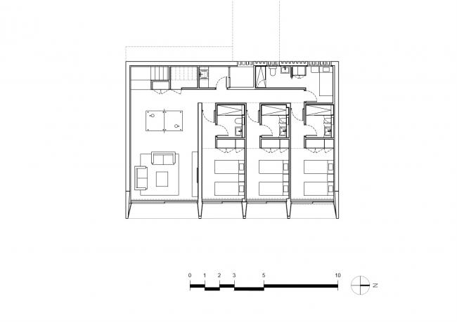 该地块的陡坡和场地规则使得房屋选址的位置变得非常有限。为了避免前面的房子挡住海景视线,房屋被推到地块的最高点,主入口位于一楼。为了进一步保持清晰的景观视野,传统的空间规划模式被颠倒,使休息区与卧室位于地面层,只有主卧室在顶层,这是为了回应客户的要求,他们想要一套夏季别墅,便于他们在周末短暂停留时开放,也许只有夫妇两住在那里。这样,房子可理解为是一个单层阁楼,为孩子和楼下的客人提供了一个可延伸空间。