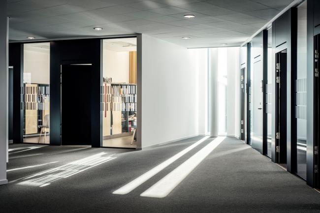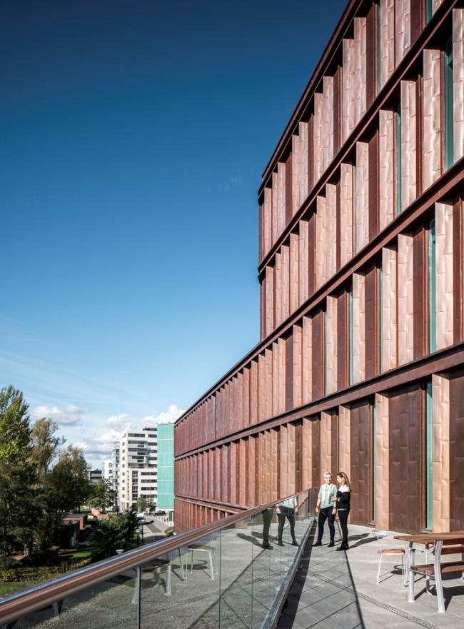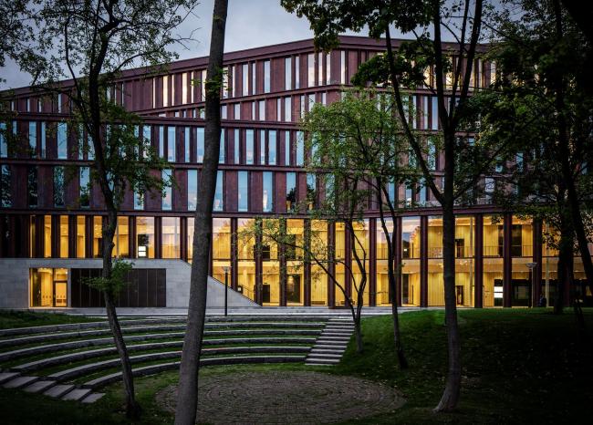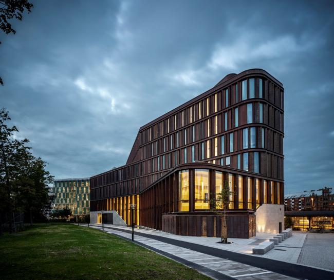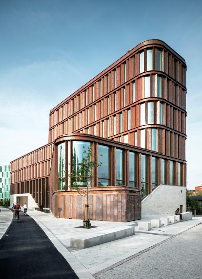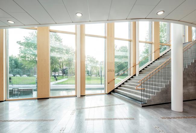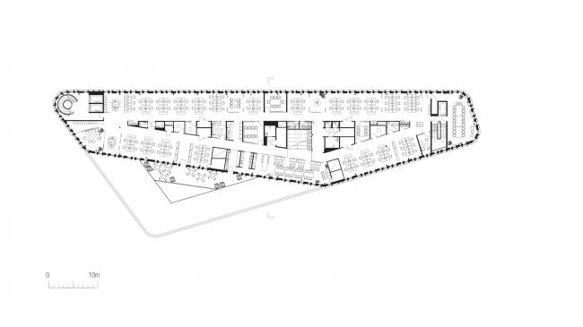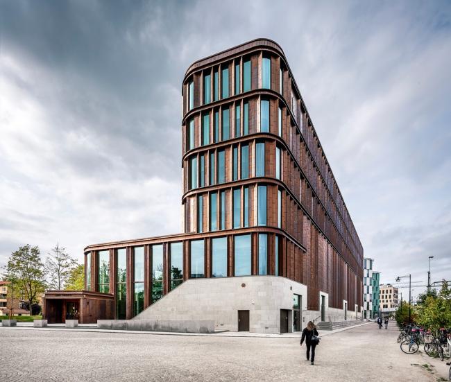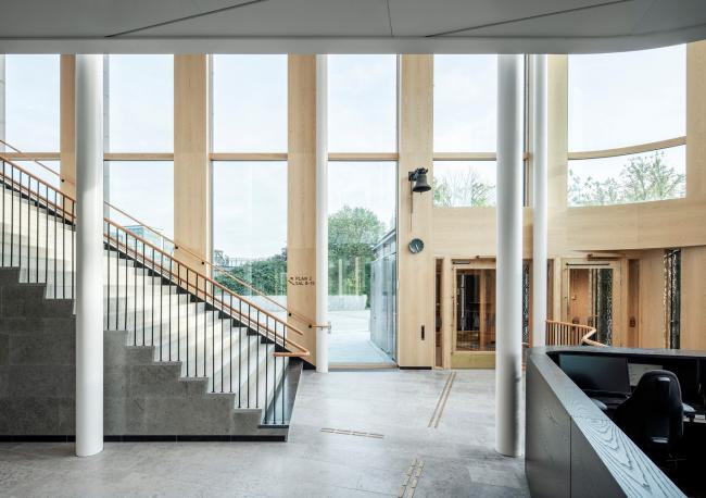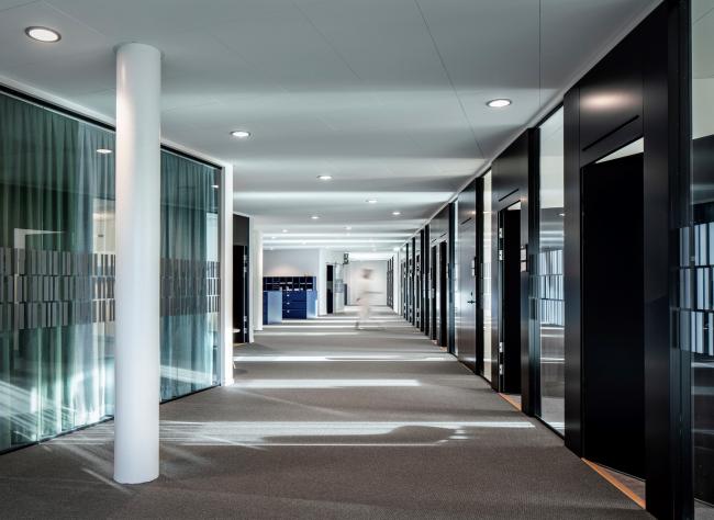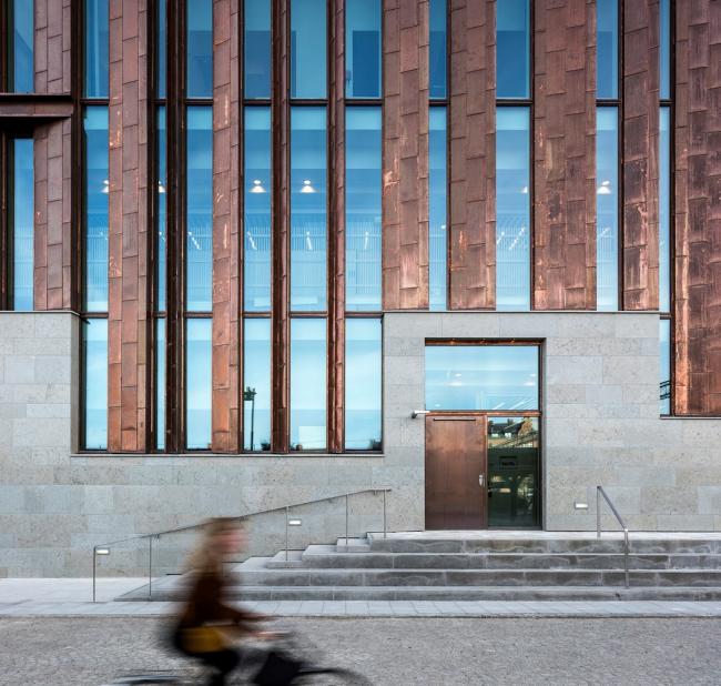 铜板、玻璃和石灰石与室内弯曲的油灰饰面板彼此和谐。向公众开放的区域设置在双层通高的开放空间内,巨大的玻璃窗面朝公园外面打开。透明部分和非透明部分之间的比例关系经过仔细设计之后可以平衡视野范围、日光照射和可见性之间的关系。建筑通过造型设计形成两个与员工食堂相邻的屋顶平台。