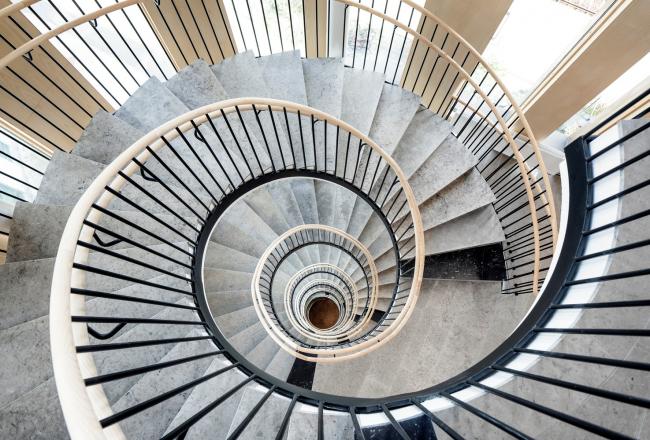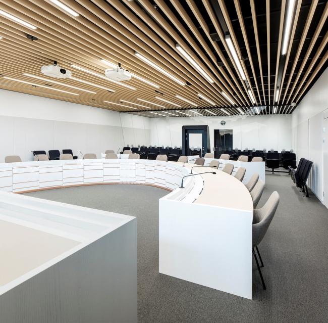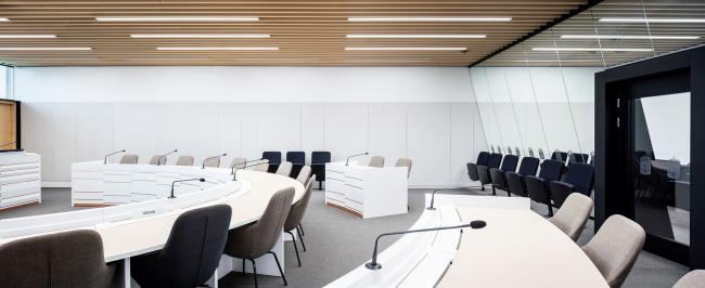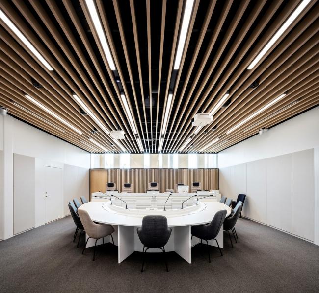 整座建筑建造在一层高的石灰石基座上,倾斜的部分将公共空间的楼梯包含在内,楼梯通向周围的公园和城市景观地段。一面水镜将光线和绿树反射到建筑中,同时营造出一种恰到好处的距离感,保护隐私性功能和司法安全不受公众视线的干扰。