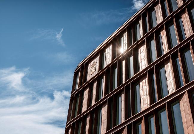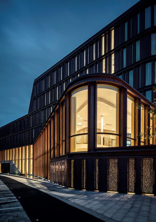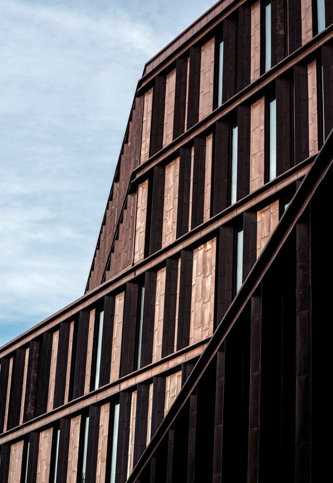 法院是Kristallen市政办公大楼的一个组成部分,二者拥有同样立面肌理。建筑的南面朝向新建造的广场,参观者进入法院内时就会置身于一个两层通高的空间。建筑立面采用铜和玻璃这两种材质,垂直的立梃有助(BIM学习)于遮挡阳光,水平的隔板则有助于建筑形成一定的比例感。