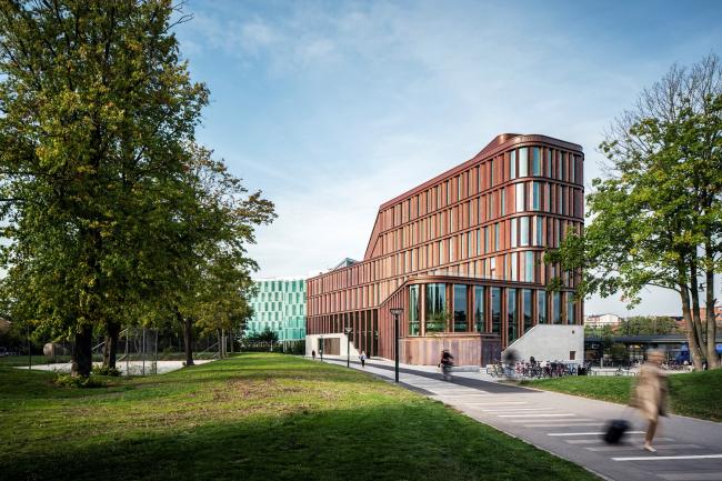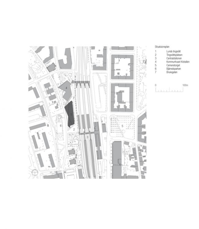 新的地区法院是正在发展中的中央隆德区的一个组成部分,该区域紧邻铁路线西侧,而法院大楼位于名为Bjeredskarken的公园旁边。场地北侧的现有建筑群向公园打开,新法院大楼所在的地块融入城市肌理中后会将公园的光线和绿地引入建筑物中,同时在公园和铁路线之间形成清晰的边界。