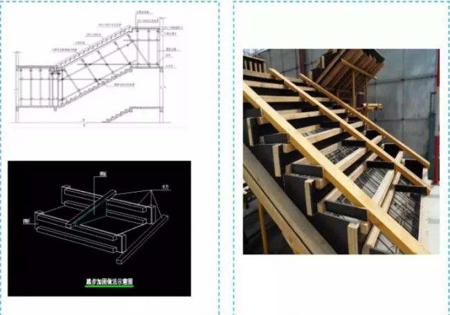 2、梯段板模板应采用斜面垂直式双排钢管支撑,严禁使用单立木耙式支撑。