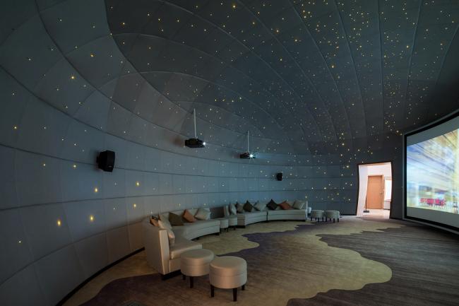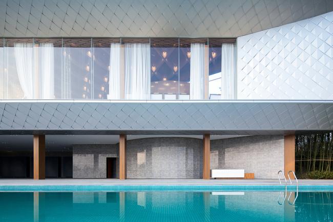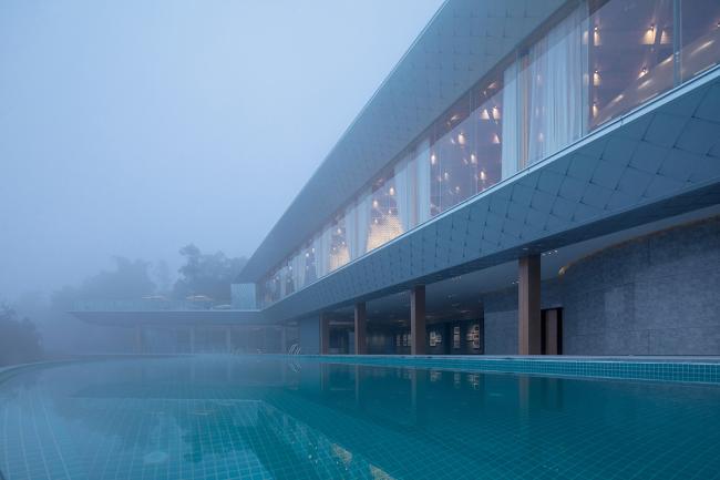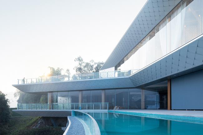 设计上追求内部功能的理性清晰明确的逻辑思考,把内部的事物规则体现在外在形式上。在这座临崖会所中,简单明确的几何形体堆砌与穿插,包含展示中心、时光画廊、球形放映厅、临崖无边泳池、露台酒吧等,将室内外空间连成一体,通透而又自由流动。