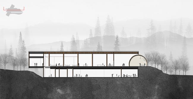 建筑强调一种透明与轻质的特性,并呼应建筑与自然之间暧昧关系的存在。当面对自然时,经由空间中隔断界质的界定所表现出来的那种人和自然之间所存在的可见或不可见的暧昧与模糊的关系,与细致情感的再抒发皆于本案中体现。东北侧的竖向观光电梯,高度约为30米,是人与建筑连接的桥梁。