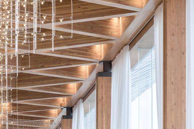 胶合木结构具有天然的美学优势,不仅作为结构构件,更能作为装饰构件,丰富室内空间,空间在结构的衬托下更接近于自然,创造出视觉上的美感和心理上的和谐感,增加了空间的叙事性。