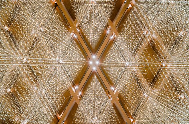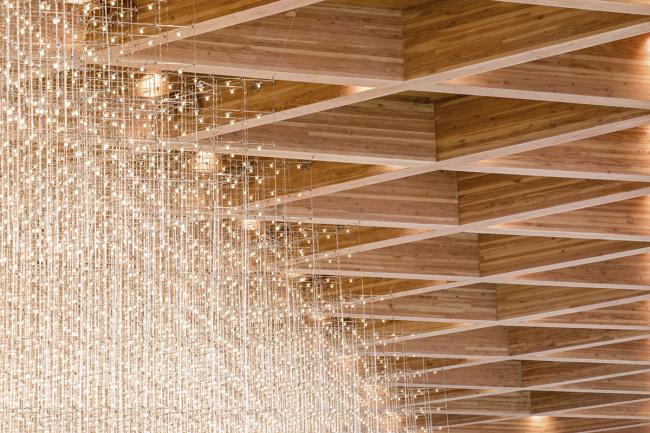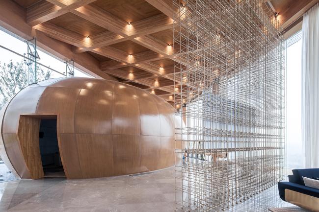3.7米X2.3米的菱形木格构空间有强烈的序列感,游走于该空间的人们并不会收到混乱的视觉冲击,反而给人一种震撼心灵的波动。功能及流线与建筑结构本身形成良性互动,胶合木构件弱化了空间的空旷感,并增加了空间的层次感与写意性。