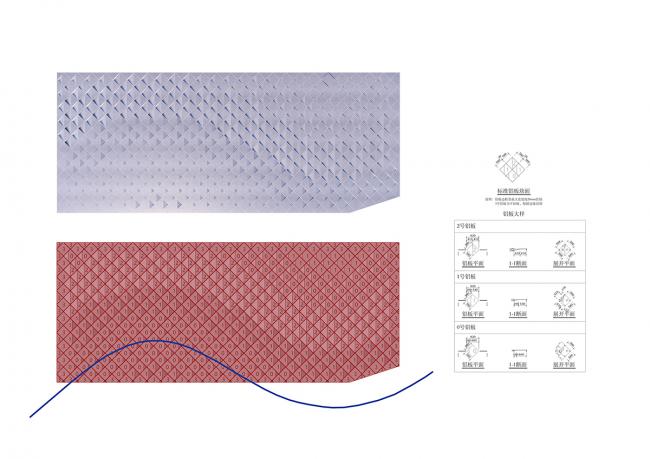 建筑的实面表皮采用色调为高级灰的金属铝板,以三角形为母题的构图方式排列。对铝板进行了变化设计,采用参数化技术,精确的控制到每块铝板的折角变化,通过有序的数学排列使建筑表皮产生优美的变化,使得建筑带有正在进行的流动之美。