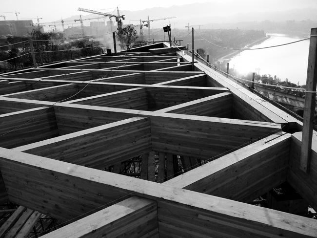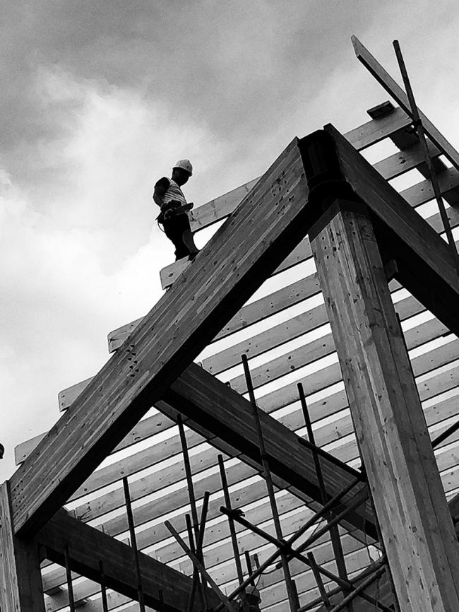 本案主体为胶合木结构,墙体与屋面为轻型木结构,是高装配率建筑,能够突破悬崖场地施工难的限制,在阴雨绵绵的冬季,仅3周之内便完成主体结构的搭建。施工现场无需塔吊,降低了施工场布的需求及费用。