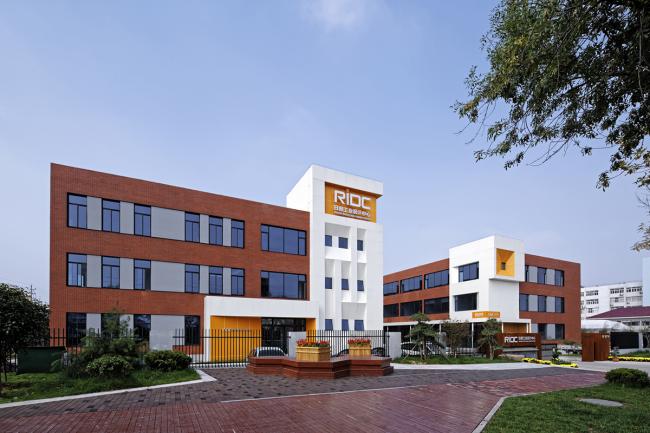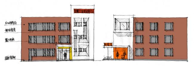 日照工业设计中心由日照经济技术开发区主导建设,由丁伟及其团队策划。园区位于日照经济技术开发区太原路69号,原建筑为1995~1996年间建的厂房,分为南北两栋,长方形东西向平行布置。每栋楼各长72.2米,高度13.7米。南楼宽26.7米,北楼宽22.6米,均为三层,中间主体部分是原来的厂房空间,两端是楼梯间。在两栋主楼的北面,有一排一层平房,也是园区的北侧边界。园区东侧是太原路,在与太原路之间有一条绿化带,市政部门做了景观改造,这样园区与太原路之间有了一个缓冲带,能更好的相互映衬。