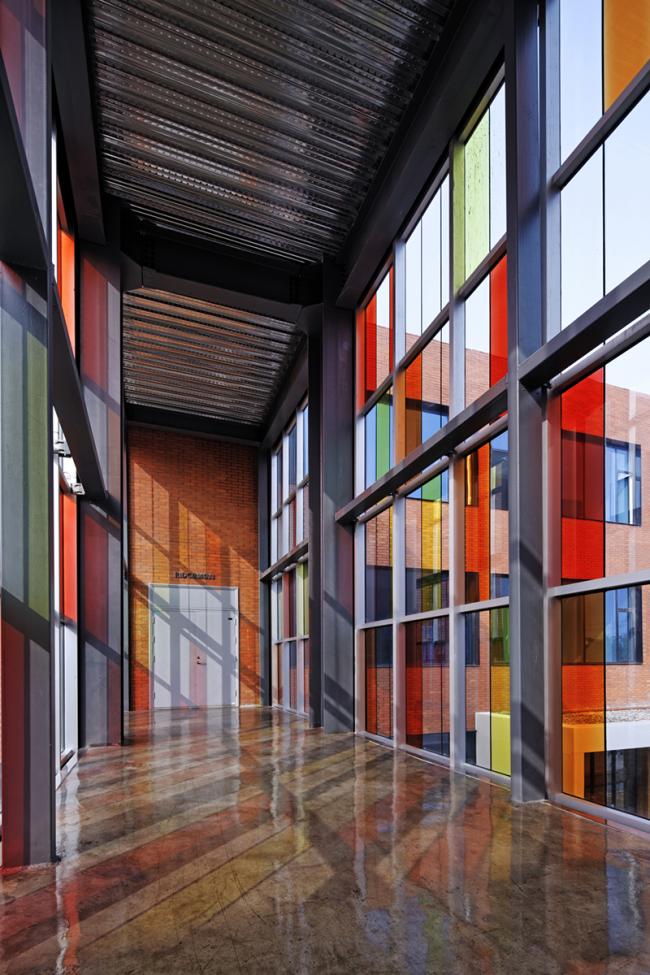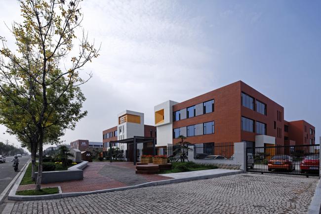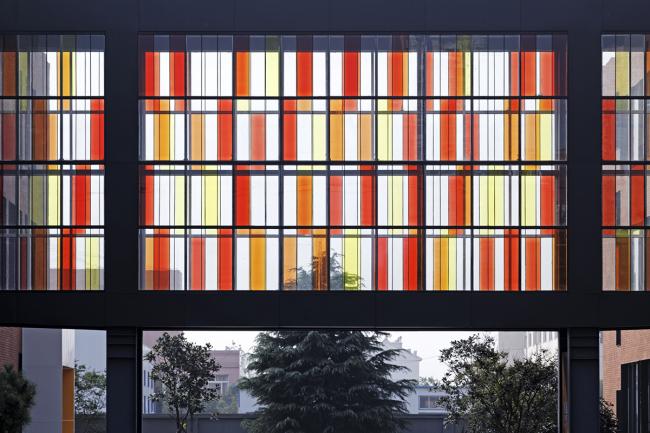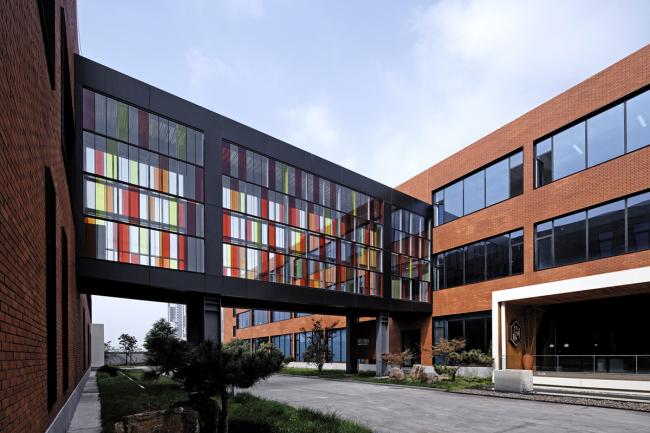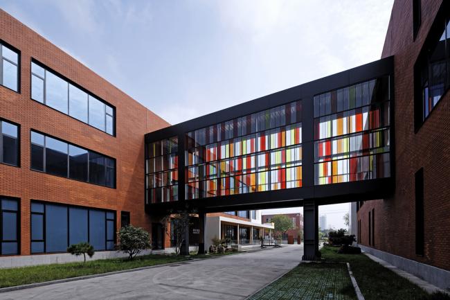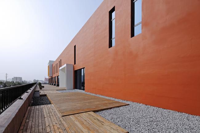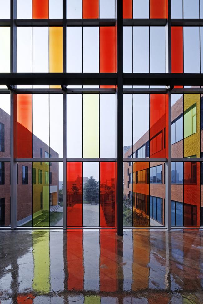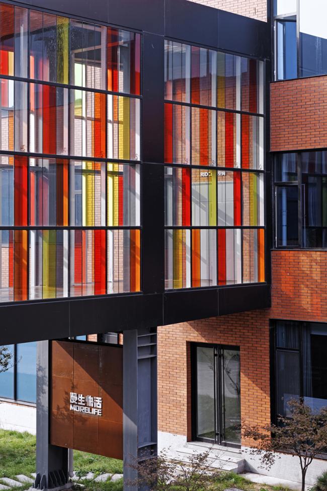 原建筑外墙是在当时常见的蓝白相间的马赛克,该街区有多栋楼都是这一材质和色彩,且已开始剥落。为凸显中心做为一个领导、研发、孵化机构的文化气氛,采用红色外墙砖为主的立面装饰。这种贴面砖在世界各国大学建筑中应用不少,因此被很多人称作“大学红”。这一材质的应用赋予了建筑书卷气。但由于造价紧张,没有朝向入口及内院的立面采用了红砖色的外墙涂料。整体红色为主的外立面在白色造型和局部少量桔色块黑色窗套钢构等线条的搭配下充满了热情和明媚,化解了方形直线条为主的刚硬与冷漠。感性与理性在此得以融合体现。立面造型与色彩的变化使熟悉该街区的行人也产生了强烈的新奇感,从一定程度上满足了业主提出的建成“地标性“的要求。利落的体块造型与对比强烈的色彩在当地的充足阳光下更显清新亮丽。