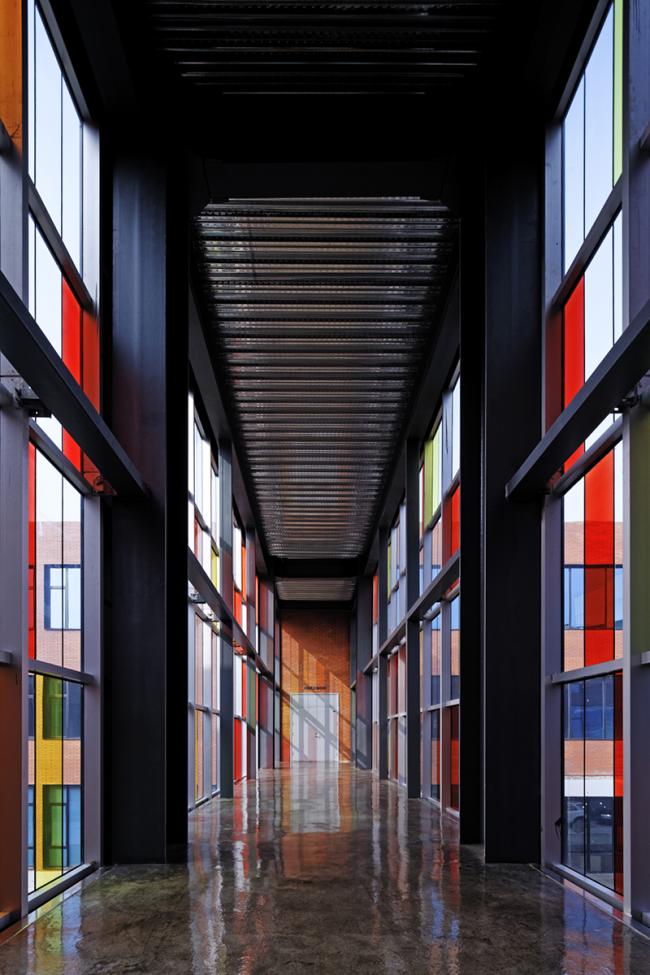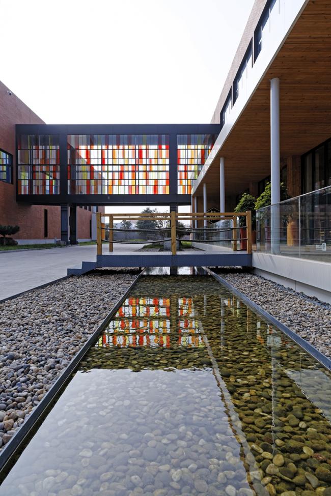 园区功能主要分为日照工业设计中心、工业设计史展厅、行政接待、美术馆、创客办公室、创客咖啡、创意设计品店等内容,分别位于两栋楼的6个楼层。做为“设计立县”计划的重要一镇,日照中心为便于开放后各地及本地相关人员、机构观摩、交流,在南北两栋楼的二层中间部位设置了一座天桥连廊,使南北两栋楼的参观、交流活动更加流畅便捷。钢结构框架及彩色玻璃光影组成的天桥连廊成了中心正对园区大门的一个标志性元素。
