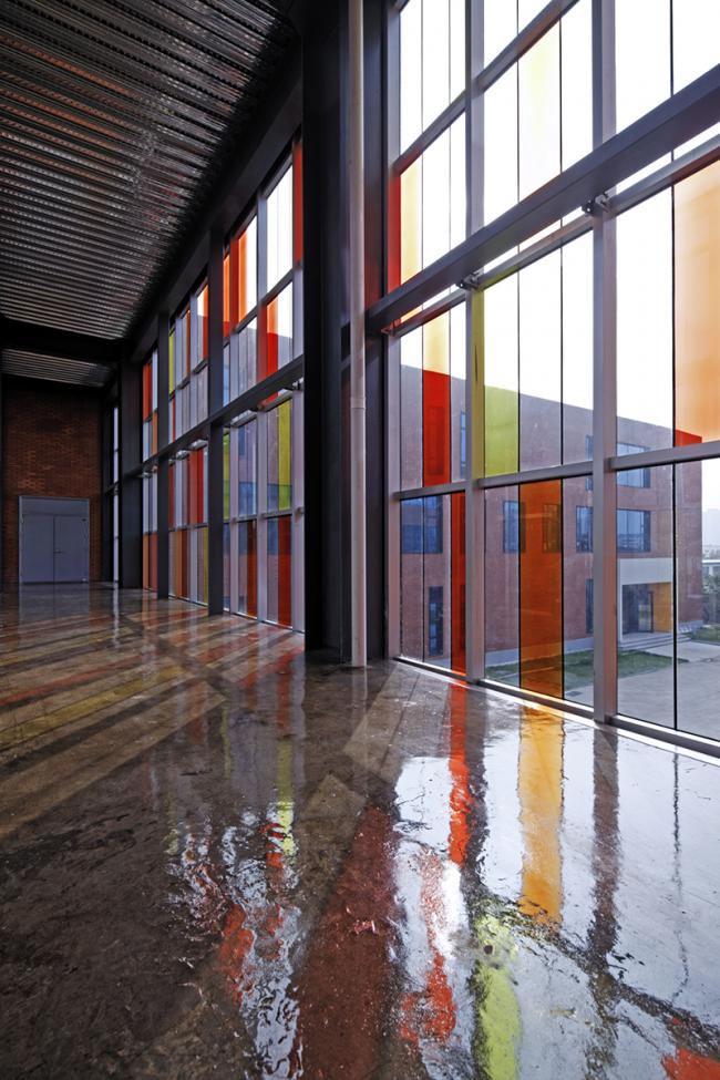 第一部分是南北楼楼梯间的改造设计,但造价紧张,只有南楼主楼梯间进行了实施。有时设计并不需要多复杂,楼梯原有扶手只是麦秸板进行装饰,从建筑外立面的红色、桔色向室内过渡到了麦秸板的淡黄色,这一色阶的延续强化了做为中心室内交通空间的重要性和一体性。