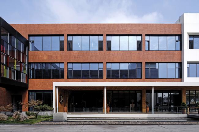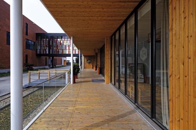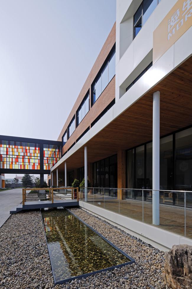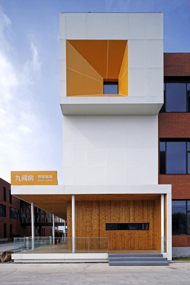 北楼在朝向大门一端也设计了一个白色造型与南楼的造型相呼应,但其高度略低。在一层做为咖啡厅的这一部分的窗外,设计了一条横向有顶的阳台,朝向两个楼之间形成的院落内部,阳台也是咖啡厅的入口,这一灰空间的插入使两栋楼之间的院落立刻有了顾盼的气氛。