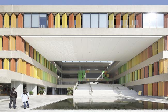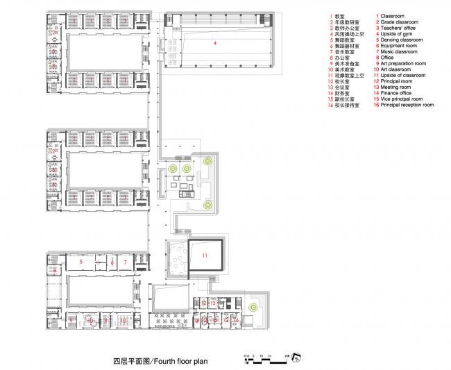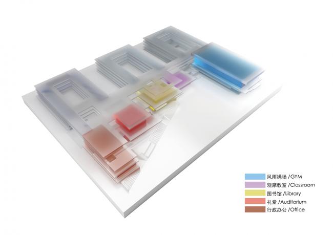 如何将苏州传统的书院文化和当代教育理念相结合,是苏州科技城实验小学设计的思考起点。当代的基础教育一直是在探讨如何提高学生全方位的综合素质的争议中演进。一方面要保证学生有效的足量的知识摄取。另一方面,又希望学校模拟的微型社会环境,可以弥补学生在家庭中社会性教育的不足。我们据此提出了一个更为积极和谐的“垂直书院”系统,对传统书院模式进行延续与再造。