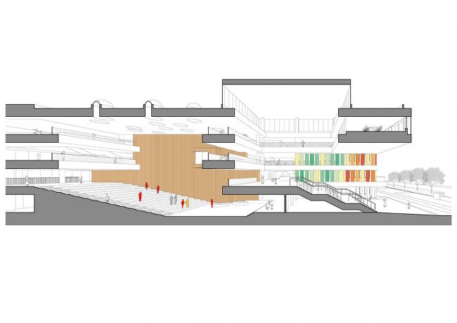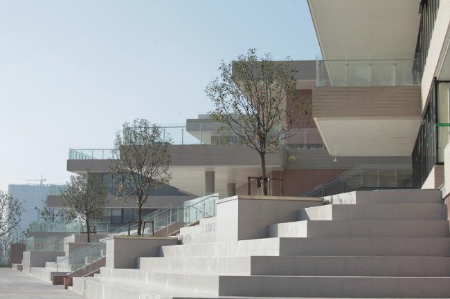 在与历史文脉、城市发展、教育思考、以及童年记忆的一次次对谈之后,最终,我们在这样一个用地紧张的基地上,通过高密度的水平与垂直相结合的空间模式,构建了一个亲近自然的多层次的交往空间,提供了一系列灵活多变的教学场所,鼓励学生在此漫步、玩耍、相遇,相对于国内通用的教育空间模式,这样的处理更易于激活并形成多样的教学方式,同时其公共属性也有益于培养学生的社会能力。园林般的空间体验延续了这个城市的文脉,而将其在竖向叠加的做法有效地解决了本项目校园活动空间不足的缺陷,形成了一个垂直的书院。