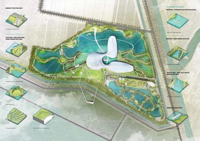 该项目被官方正式命名为“上海长江口中华鲟自然保护区”,由ennead事务所的设计合伙人托马斯·黄(Thomas Wong)主创,在Andropogon 景观设计事务所的协助下完成。整个方案由水族馆和研究部两部分组成,建筑面积达427000平方英尺,位于占地17.5公顷的风景保护区内。水族馆和研究部共同致力于增加中华鲟和江豚的数量,并进一步鼓励公众积极参与到支持生态保护的事业中来。