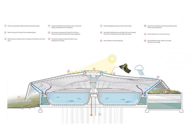 设计将各项可持续发展方案高度整合,将夹层胶合木结构、地热供暖和冷却循环回路相互结合,并运用由土生和水生植物共同构成的湿地达到快速碳固存和场馆用水净化的作用。此外,景观设计方案重新构建了长江流域的海岸线系统和各种生态区域。悬挂式走道和观景区与园区相连,让游客充分沉浸在自然环境中。