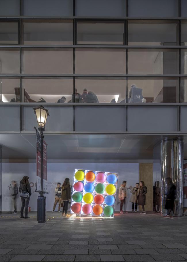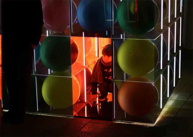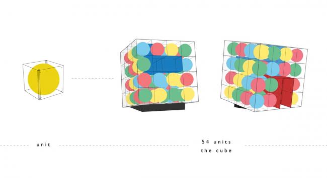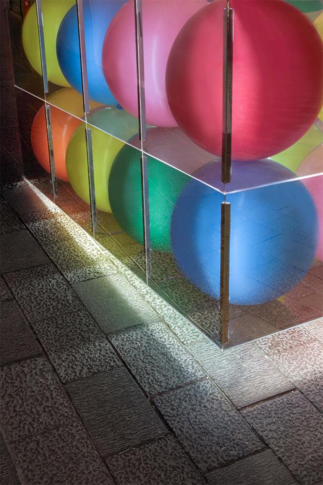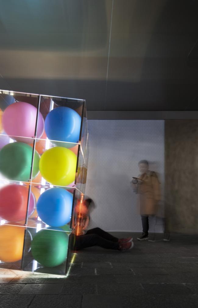 感受是绝对正确的,它不能归纳,不能分析,只能描述。回到直觉,它要求我们悬隔假象,还原到最基本的现象。于建筑,我们从冒险的形式突进中,重新回到最基本的单一几何形体。从一个正方体出发,透明盒贴上镜面膜,再藏入彩色气球。当正方体开始叠加,你终于看到唯一的自己。日常的构造和材质支撑起梦幻的一刻。