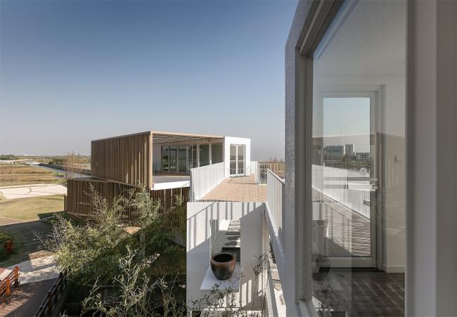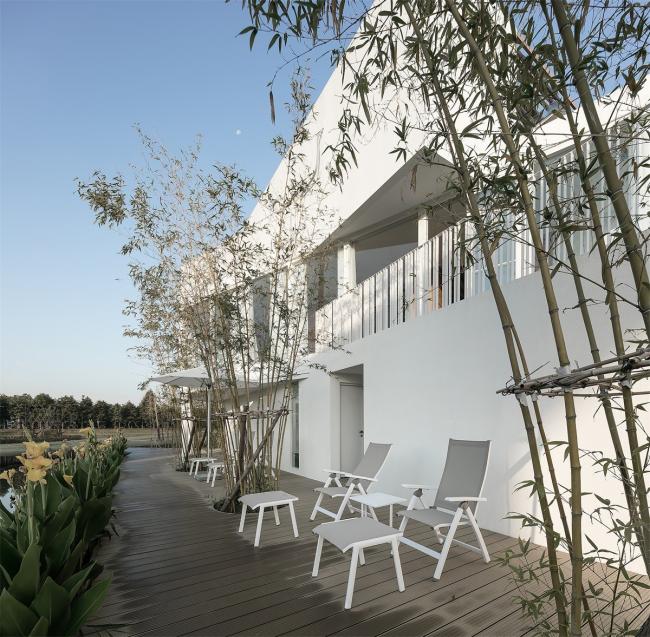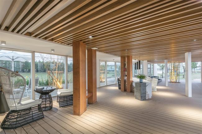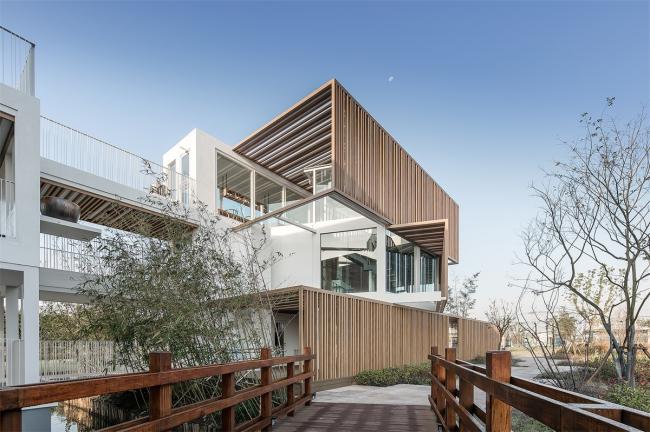 整个建筑群的颜色由白色和木色构成,浅原木色搭配白色给人以干净,简约,现代的视觉感;结合周边大地的绿色衬托,使得整个建筑与自然分外协调,相辅相成。