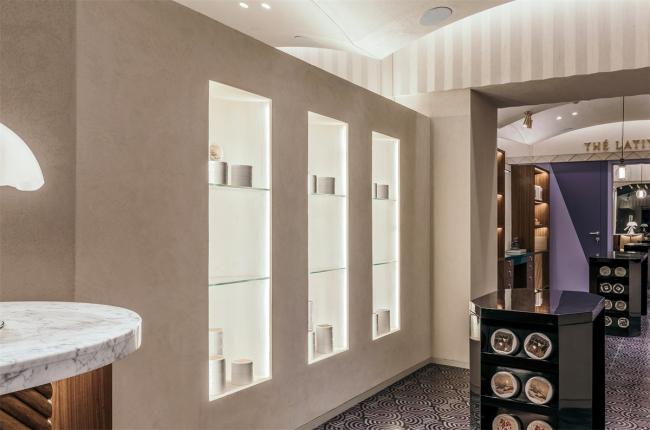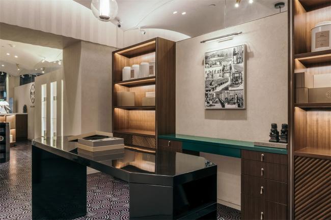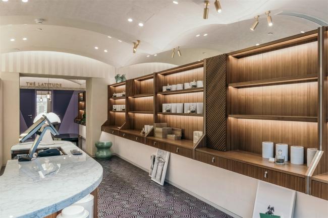 右侧主货架悬挂在墙面上,将小空间内的陈设处理地很轻盈,货架选用古老的胡桃木色,整体线条简洁明快,金属条镶嵌于接缝处,抽屉上配有经典悬挂式拉手,门板上用斜向排列的半圆形木条进行装饰(直径两厘米的,每条之间相隔两毫米,角度为45°),由经验极为丰富的工匠手工制作完成,效果准确精致,不仅是室内设计的品质表现,更是THÉ LATITUDE茶岚地打造百年品牌的匠心所在。