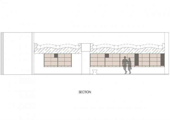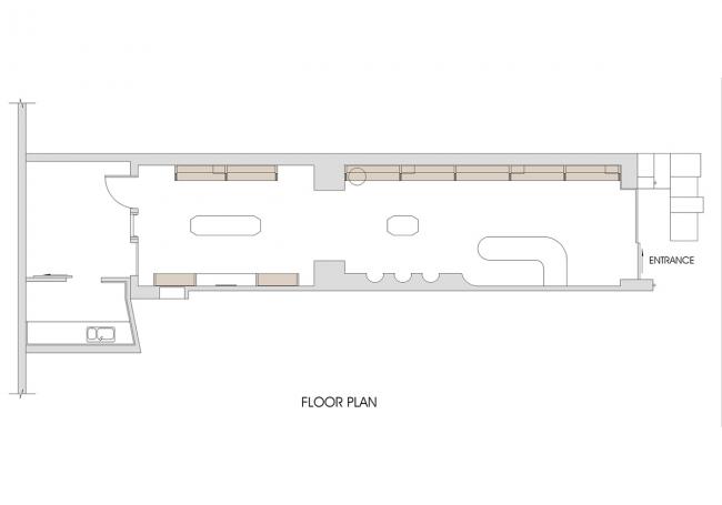 店铺形状狭长,举架很高,而宽度仅三米,易使人感到逼仄压迫,设计师主要运用拱顶来调整空间尺度,并在墙面与拱顶交界处使用(BIM工程师)镜面,严丝合缝的切割与安装工艺使拱顶在不知不觉中向两侧延伸,使室内的上部空间变得“豁然开朗”,并制造在墙壁之外仍“别有洞天”之感。