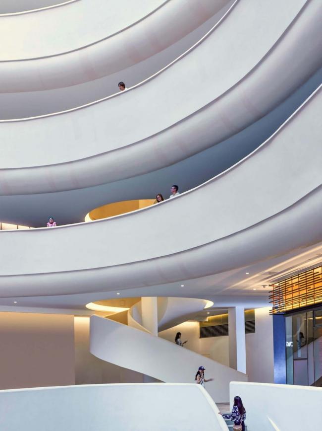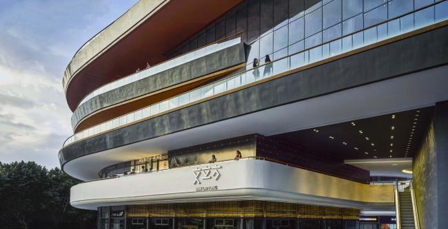 顺着基地西南展开的长达160m的弧形外廓,成为立面控制性的语言。如果忽略西北角因业主要求遮蔽厨房而设的铝格栅,整个主立面几乎可说是“没有设计”。最终展厅、餐饮等等各种功能空间在整个外廓框架的控制下呈现各自独立面目——这也许可以归结为同时作为策展人工作多年的影响吧,总希望每一个个体都有各自的呈现。