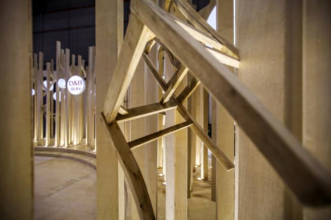 第二个区域——迷林,为一个圆形的广场空间,整个区域解决的问题就是主题空间形象与展商个性形象之间的矛盾,TOWOdesign在广场边缘用各种家具框架,结合竖向木条构成一个半透明密林空间,人们透过密林缝(BIM设计)隙可以探索性的发现后面的展示空间。通过一个过渡的灰空间解决了整个矛盾。