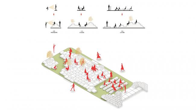 第三个区域为一个长方形的广场区域,需要一个场所能为四周的展位提供交流洽谈的空间,还能具举办整个展区的活动的场所。所以TOWOdesign运用最基本的凳子形态进行演变拓展,衍生出长凳、方凳、树池、屏风;并用他们在广场的中心构建了一个山丘,山丘的阶梯高度与形状很好的兼容了上面所需要的功能,同时还打造了一个家具构成的人造景观,为整个广场带来更多情感与乐趣。