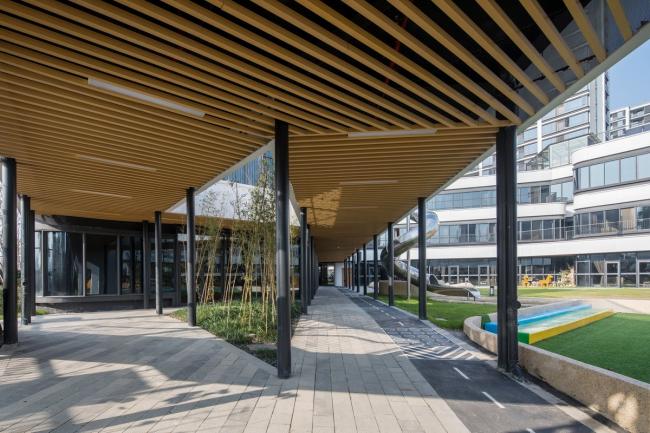 通长玻璃的设计增加了室内外视线上的联系,在建筑内可以更好地看到户外的千姿百态,而城市的人群也可以透过玻璃看到建筑内幼儿活动的天真烂漫,室内外的对视创造了有趣的生活体验。