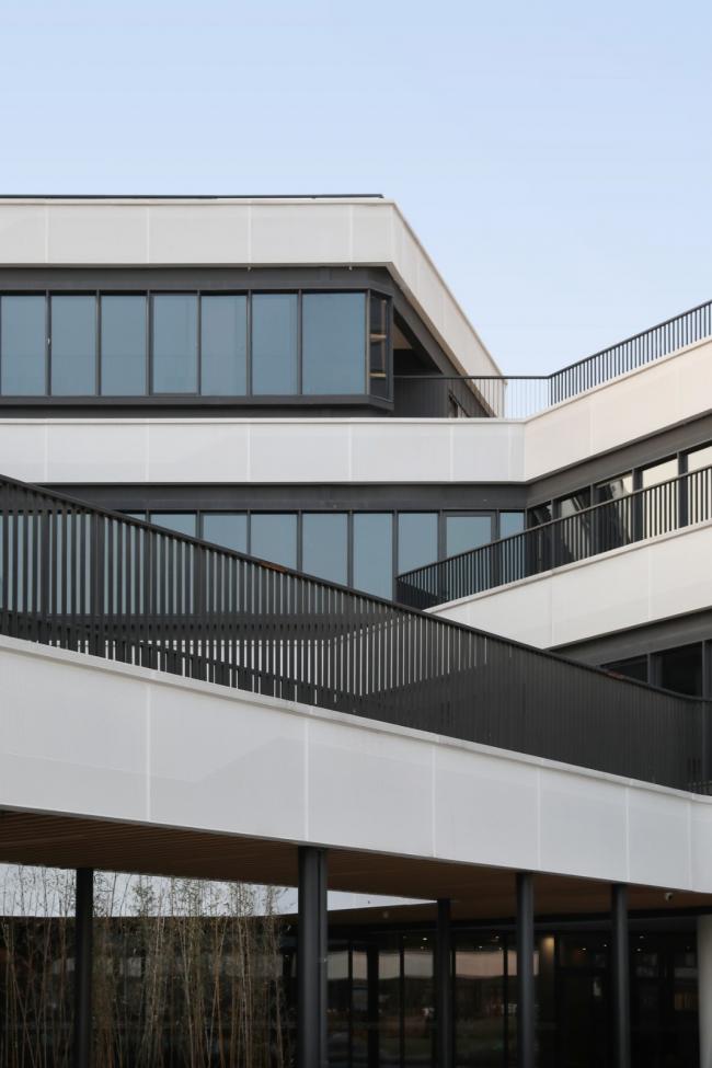 各楼层空间拥有不同的物理特性:首层室内外活动空间的渗透,二三层教学空间的连续与退让和四层办公空间的集聚,在立面上层层叠加,以纯水平线条来构筑建筑最本真的状态。
