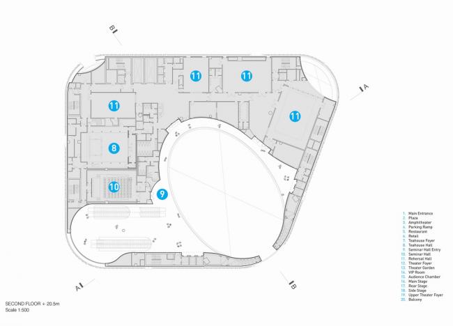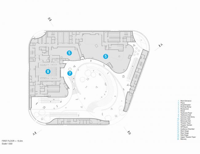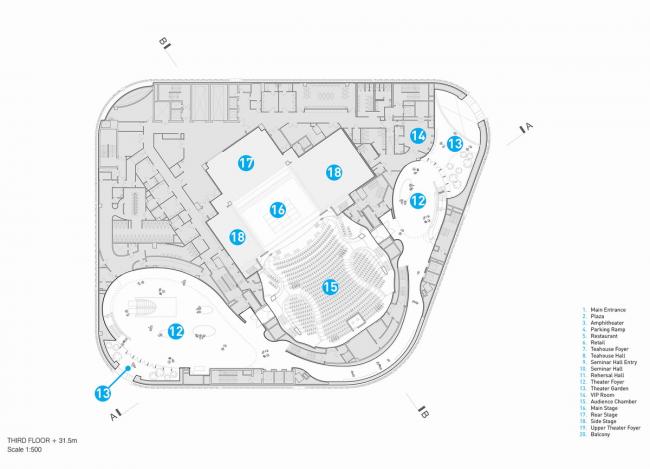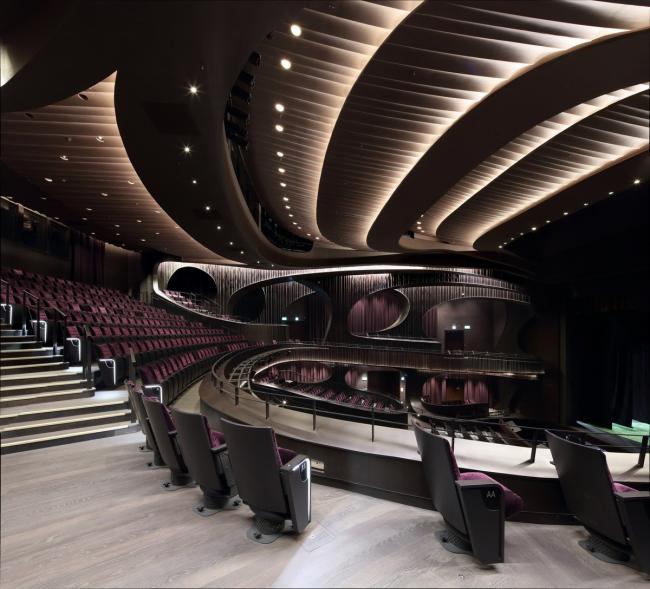这种创新的设计使可容纳1073个座位的大剧院安置于距离地面27米的建筑顶部,方便了中庭和公共广场的内部配置,同时战略性地将礼堂与周围城市基础设施的振动和高环境噪声隔离。这一创造性的设计举措非常有益,能够使工人安全地在大剧院内部和下方同时进行建设,从而缩短了施工时间。
