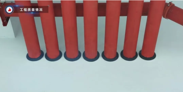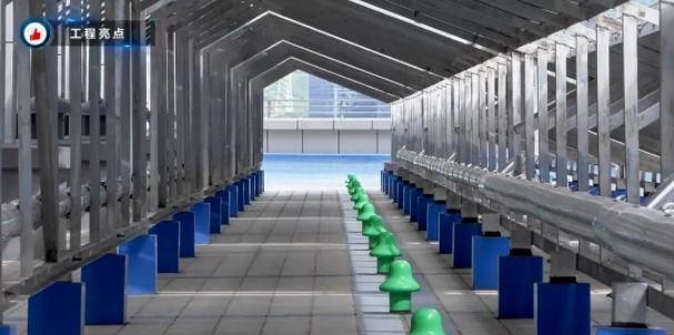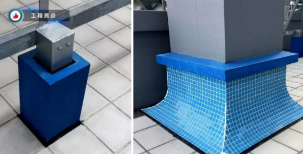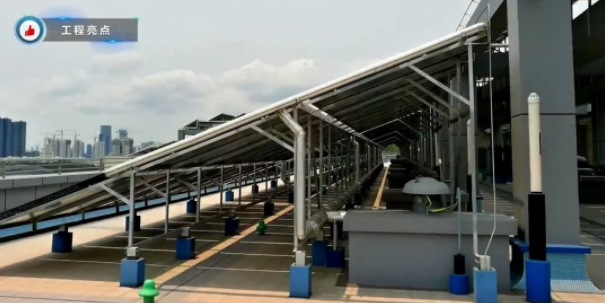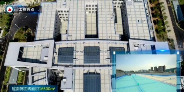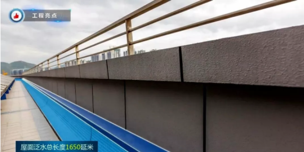 屋面坡度合理,饰面砖铺贴整齐,泛水弧度统一顺直,设备管道成排成线,细部构造精美
