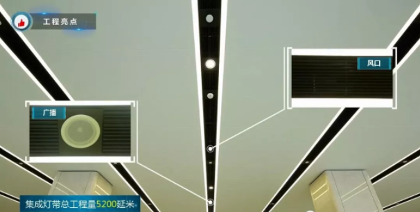 集成灯带吊顶综合灯具、喷淋、烟感、广播、风口等末端,科学合理