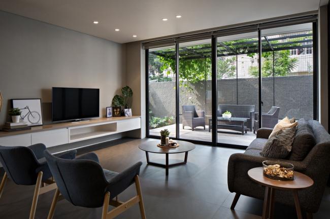 楼梯与室外直接相连,是无空调区。在楼梯和底层起居室之间,设置巨大的推拉门,可以根据需要开合。当空调打开,这些滑动板关闭以保持凉爽,日常生活中可以打开,通过楼梯上的天窗产生空气流通。