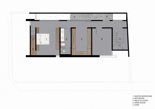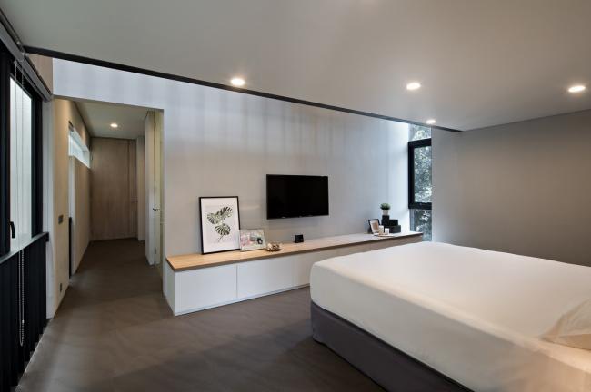 由于建筑物的正立面朝东,随机的开窗使得进入房屋的自然日光量降至最低,减少热量过剩。对于立面材料,我们决定使用沥青混合料/沥青来减少从材料吸热,使得进入房屋的热量高达70%,另一个好处是易于维护,从而帮助客户为一个平常而易打理的建筑外观。
