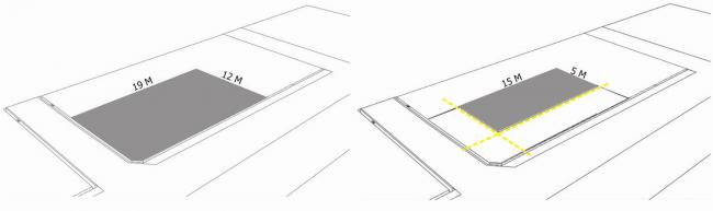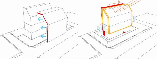 根据研究数据,我们最终希望将整体结构垫高,以狭长的地块引起垂直空间组织,并遵循土地原状。然而,狭小空间上的高耸结构可能会产生尺度过大的立面,因此为了克服这一问题,斜向切割了立面顶部的一角,使得人类尺度的观察更加协调。