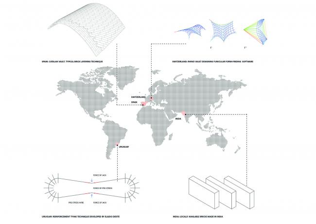 此项目所用的结构技术也成为了重新审视互相矛盾、对立已久的全球化与本土化的案例。本地区或南亚当地的建筑形式在传统式样的严格规则限制下的典型表达,通常是以牺牲材料高效性为代价的。我们对材料和高性能砖瓦结构的探寻尝试依靠的是事务所构建的知识网络带来的良性影响,因为我们能参考全球范围内拓展材料性能的经验来丰富本区及当地建筑。